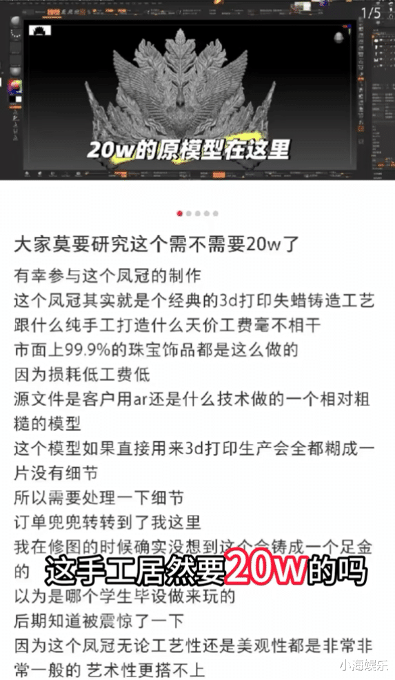 不错看出,这样多业内的瞎想师,包括参与黄金凤冠的瞎想的瞎想师,都出来打假张凯毅。民众共同不雅点是:黄金凤冠根底不是纯手工,是3d打印。老本便宜,艺术性也谈不上。是以20万工费险些是骇东说念主视听。