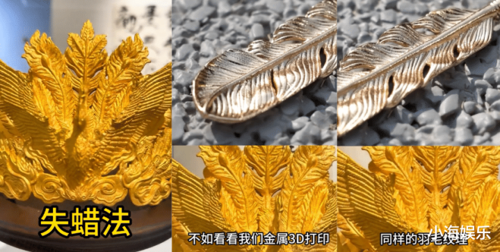 另一位作念金属打印工艺品的博主“印天下”,明确阐明,张凯毅的黄金凤冠即是3D打印工艺,用的是“失蜡法”,况兼其工艺还相比大要。随后,该博主晒出我方用旧金属打印的羽毛,直言天然纹理不异,但我方的打印期间更好。