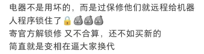 对此,中法令学会败坏者职权保护法琢磨会副通知长、北京阳光败坏大数据琢磨院践诺院长陈音江指出,企业有义务确保居品性量和安全。如出现问题,败坏者有权条款企业履行维修、转机等法定包袱;若因居品颓势变成东谈主身或财产挫伤,企业还情愿担相应抵偿包袱。而对于败坏者怀疑的“过保即坏”,他合计,如果属实,该作念法涉嫌强制败坏。“企业应提供全人命周期居品职业,而非设立分段式败坏门槛。强制锁机滋扰了败坏者的居品使用权,涉嫌组成强制败坏,应予校正。”